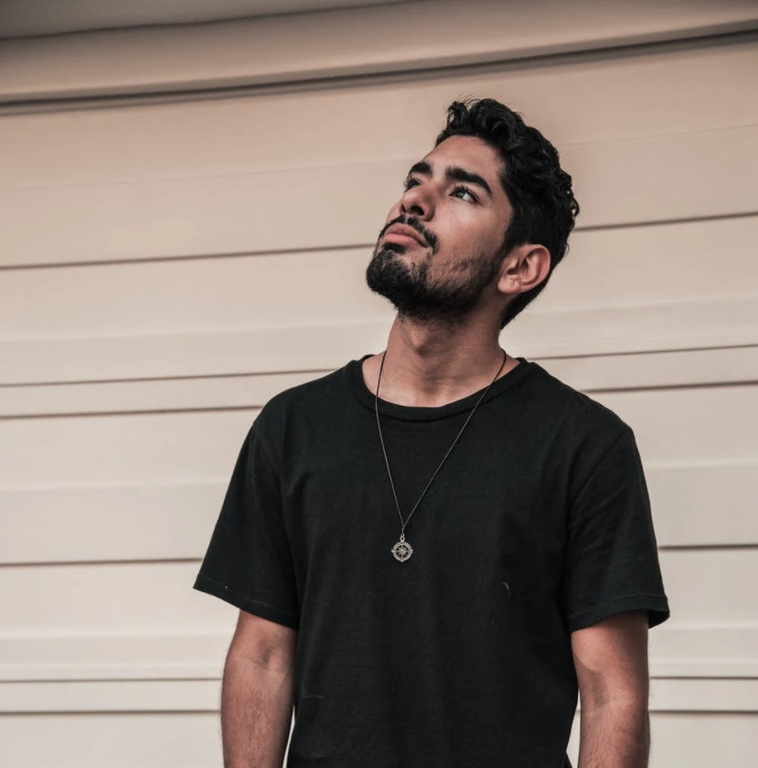 濃い青ヒゲの跡や服から